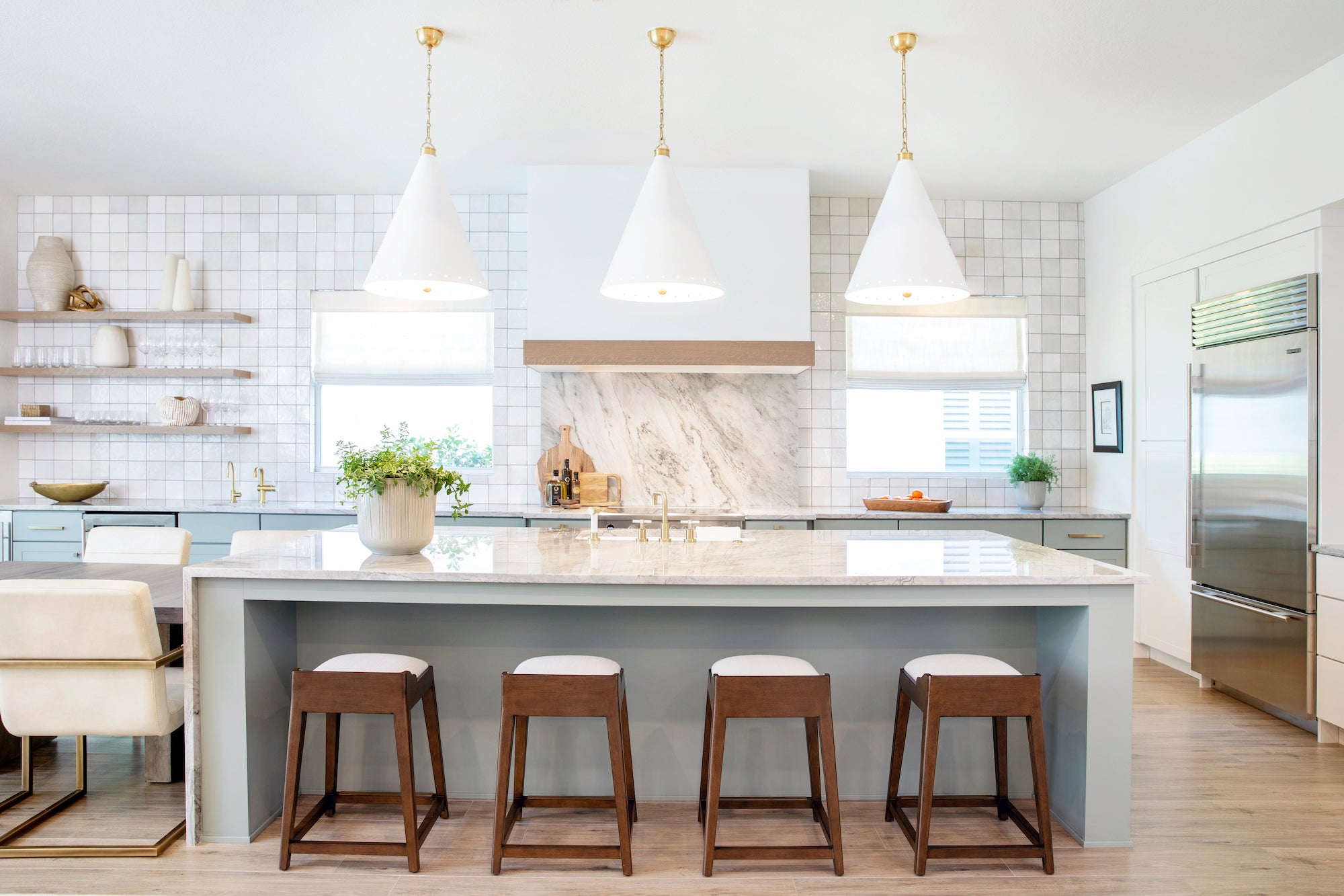 This project began as a very 90s Tuscan home, filled with faux travertine tile, arches, and yellow tones. We reworked the floorplan to be more aligned with the way our clients live in the space as their second home, prioritizing seating to make gathering easy for their multi-generational family. To create a focal point in the living area, we ripped out the outdated built-ins and fireplace and replaced it with more modern cabinetry that serves as storage, display, and artwork in its own right.