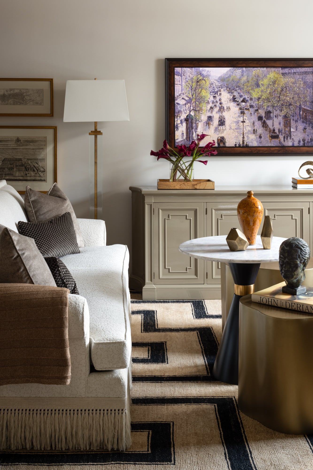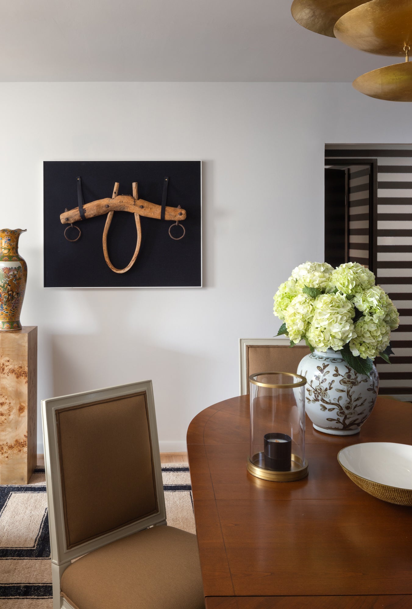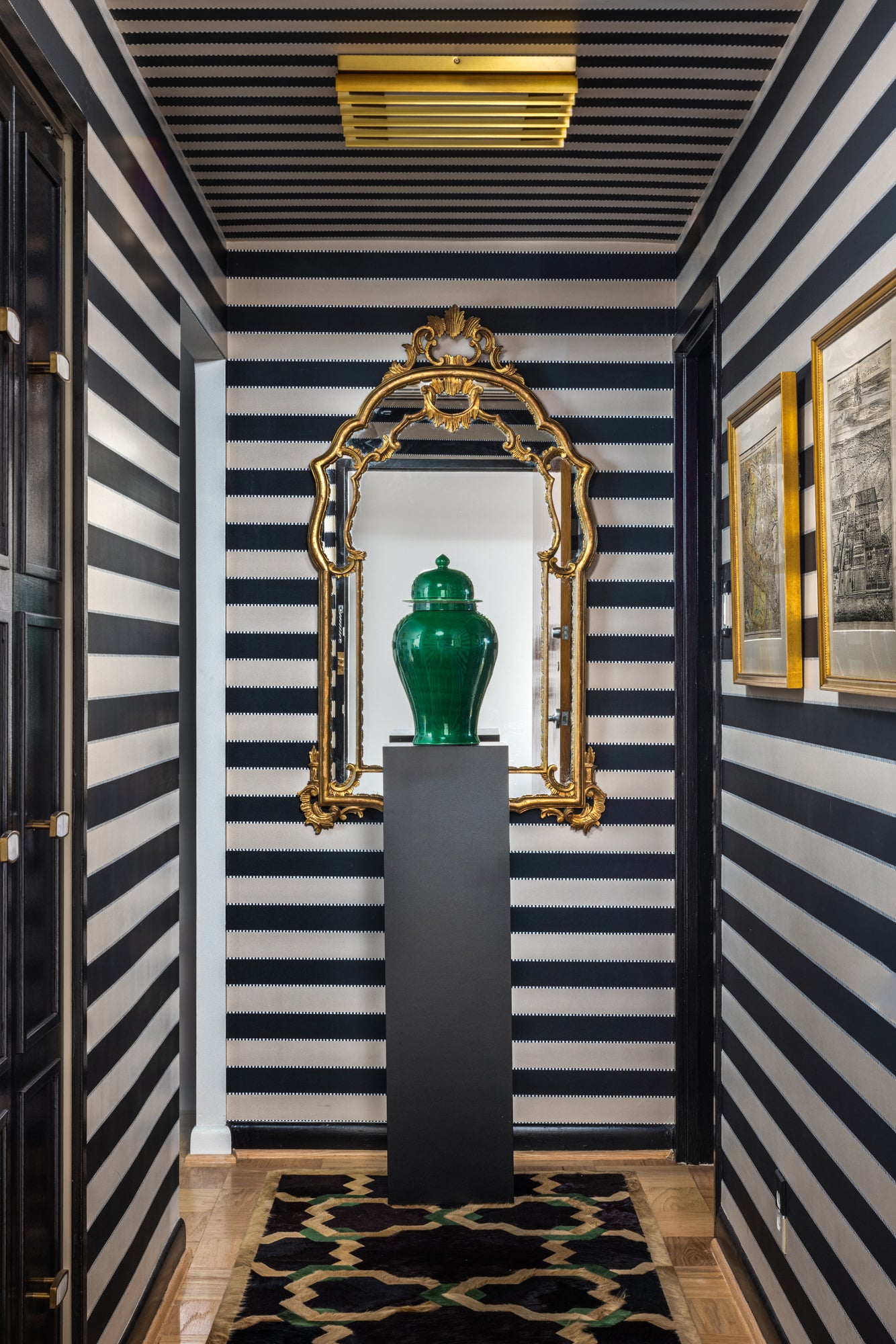 For this condo by the wharf, we crafted a curated, collected atmosphere reflecting the client’s rich history. The deep navy living area provides a sophisticated backdrop for vintage accents and a splash of green, while bold stripes in the hallway create a striking art gallery vibe. Each element tells a story—collectively transforming the condo into a personal sanctuary that echoes the client's adventures and cherished memories. This bespoke approach allows us to craft a home that is not only visually stunning but resonates deeply with the vibrant history of its owner.